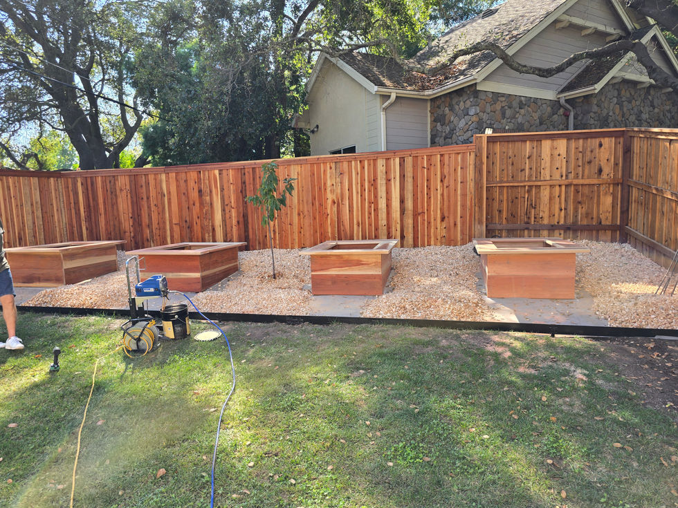 A series of images showcasing wooden outdoor spaces, including decks, staircases, fences, and garden beds.